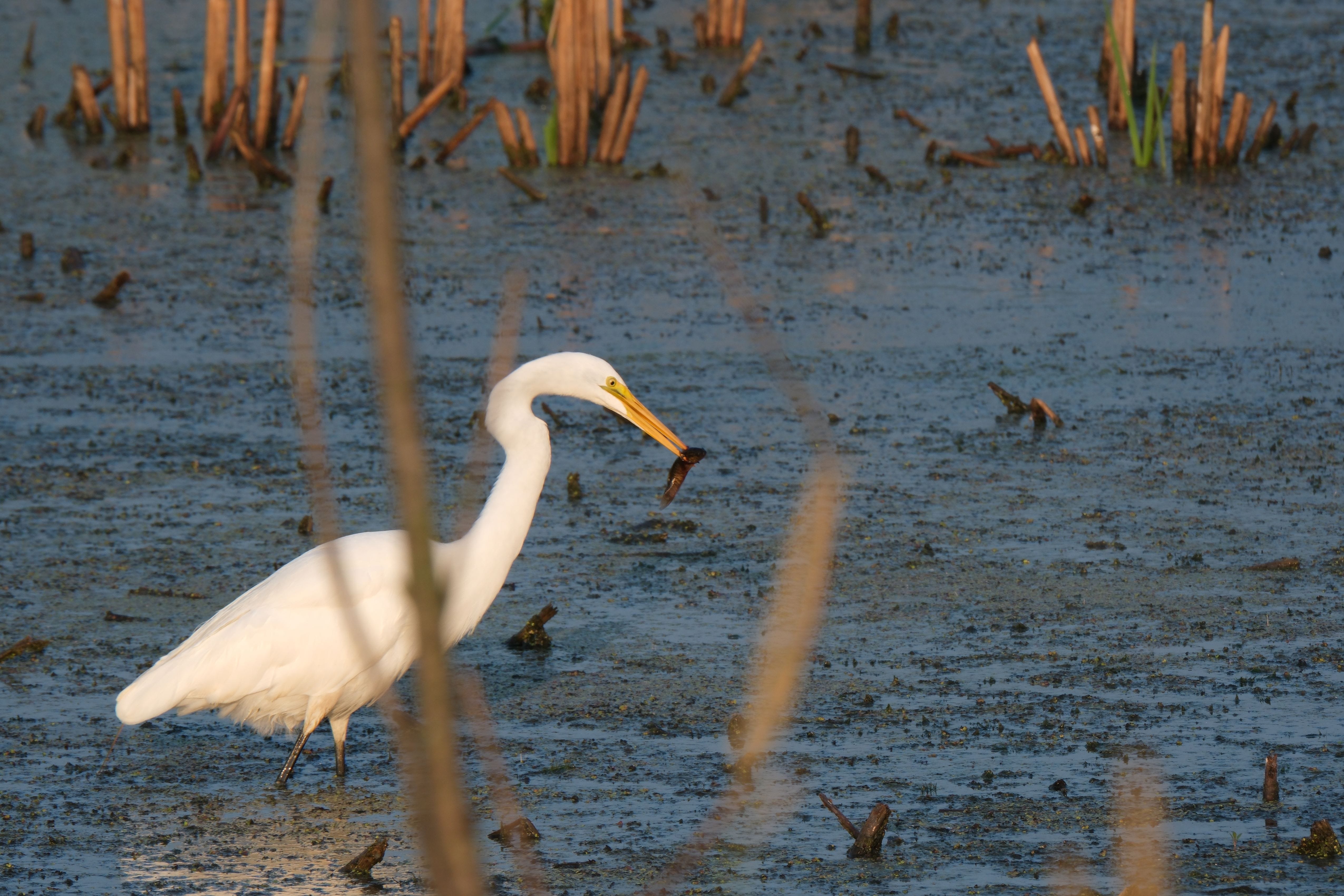 I don’t have any good action photos of the Great Egret actually catching food, but I’m pleased to have a few “food’s been caught” images. The photographic challenge is that they move so quickly to stab or grab their meal. My camera has the speed, but I haven’t gotten the timing quite right, yet.