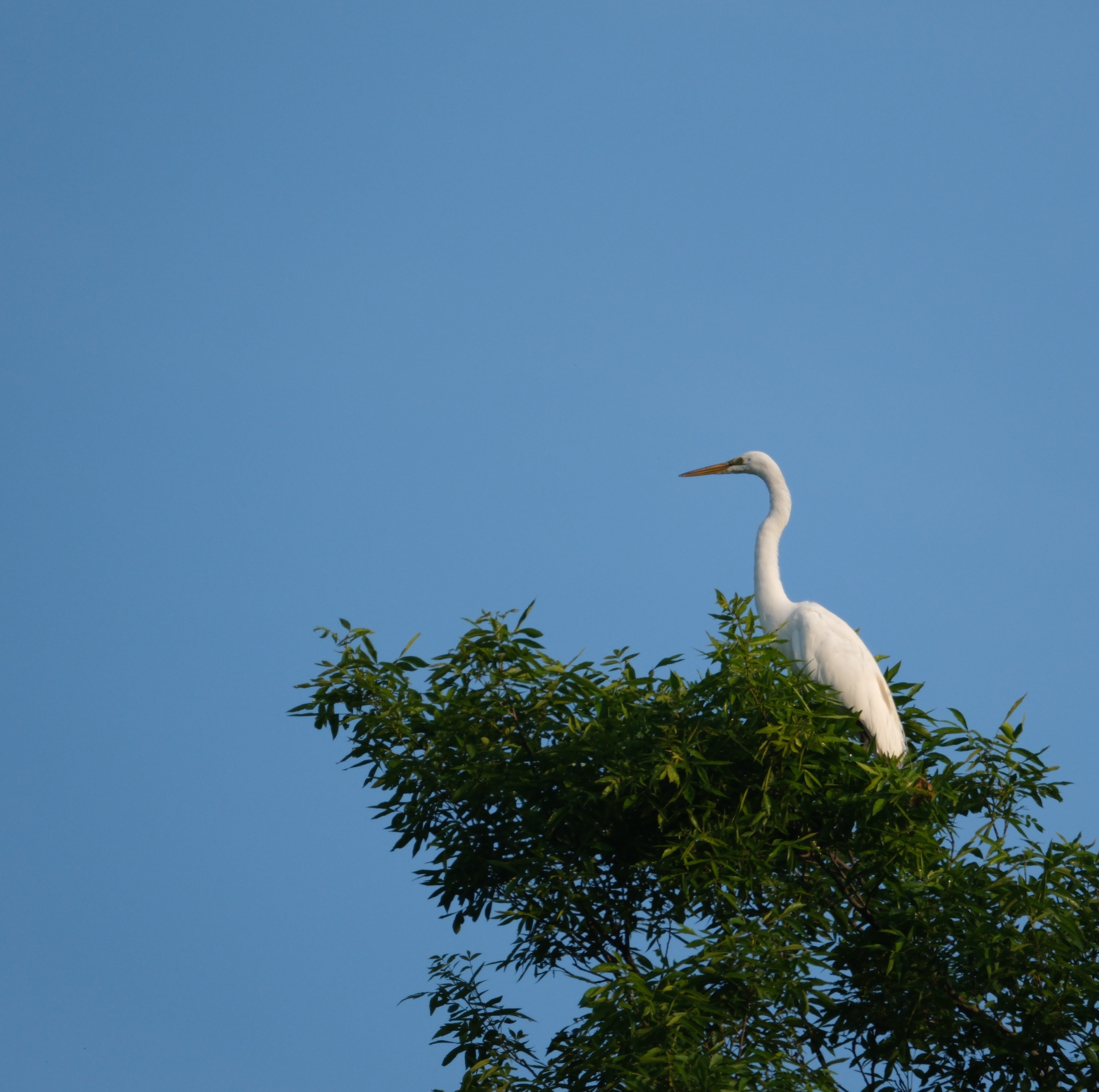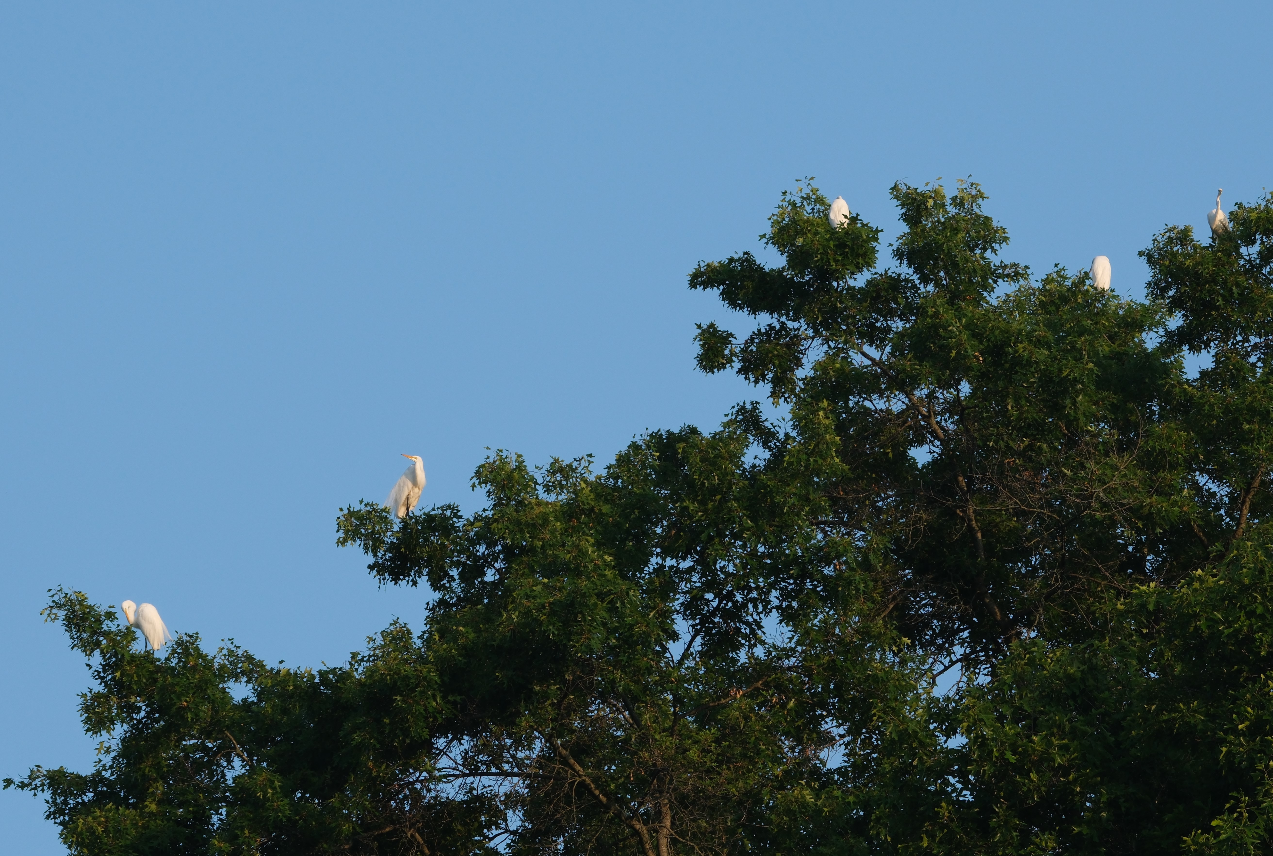 On some occasions they’ll perch in the trees along the water for a spell before flying away. I do love it when they perch in trees. Bright white spots on the intense, summer-green leaves. Looking up at them, one can almost imagine themselves somewhere tropical.