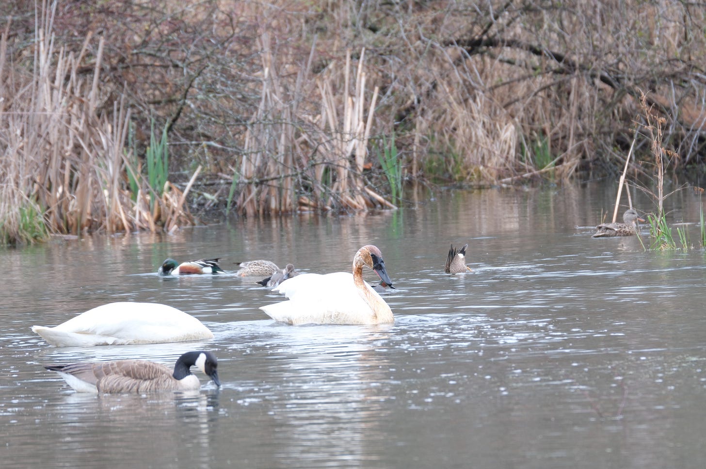 I’m particularly amused that the swans seemingly turn into floating turtles when they go for a bite. The upended duck, a female Northern Shoveler. While difficult to see, there is a male Green-winged Teal just behind the swan with its head above water. With a couple female Green-winged Teal as best as I can tell. The green of their wing isn’t standing out, but that’s likely to do with my camera skill and the particular angle of the birds.