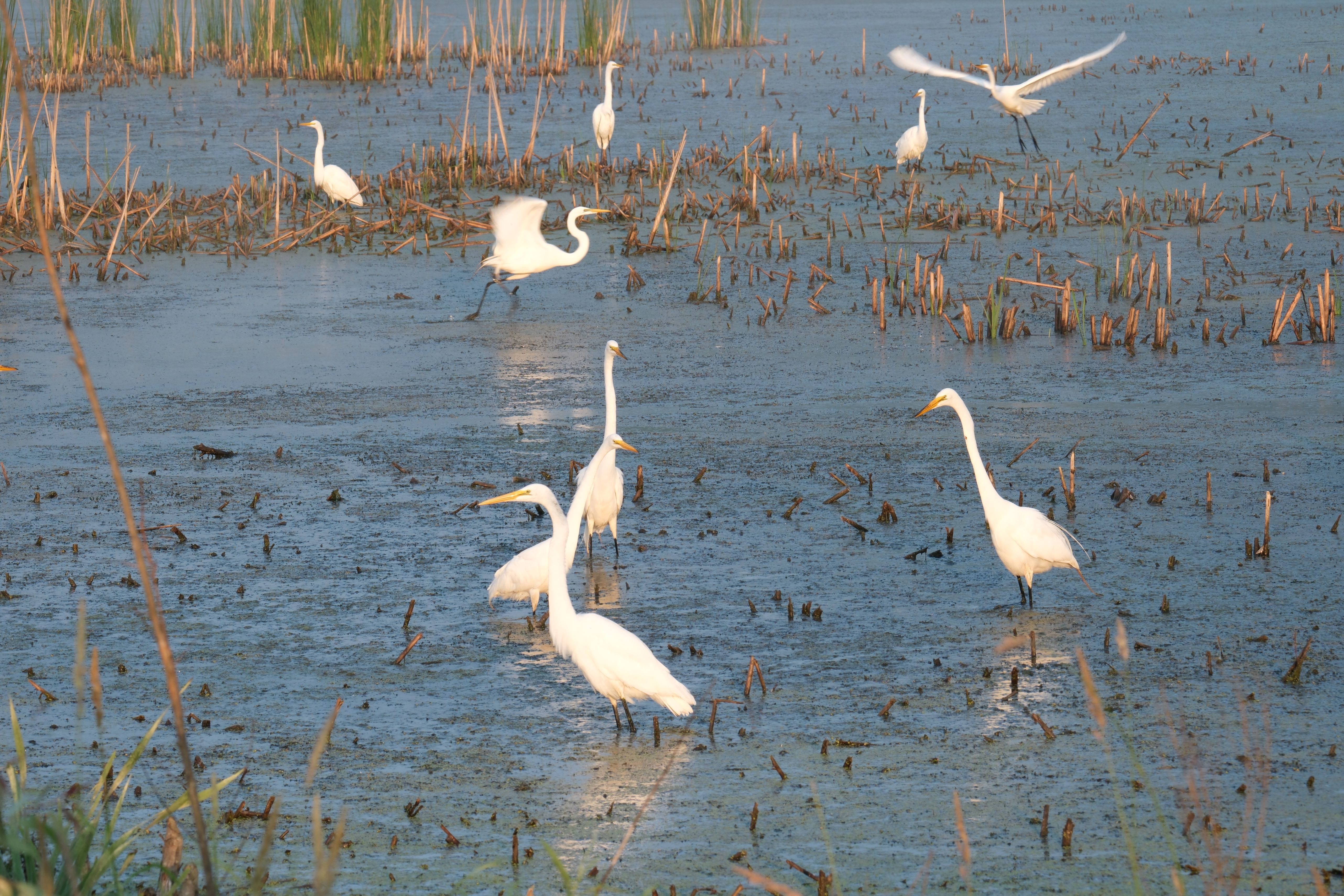 As the morning progresses, the egrets begin to depart, leaving singly and in pairs. Usually, a couple hours after sunrise, they’ve almost entirely dispersed. I don’t know where they end up ultimately. My assumption is that they’re looking for a shadier spot, avoiding the direct sun as it moves higher in the sky, or, the road along the marsh becomes to busy/disruptive, and they head to the Mississippi River away from traffic.